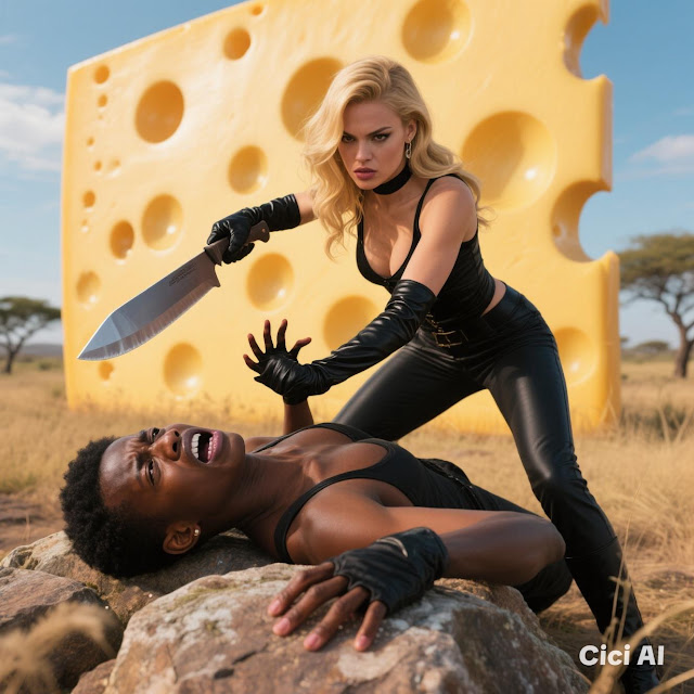 Con los cazadores eliminados, la sábana respiró aliviada. Carla, la Quesona Asesina, no era solo una vengadora; era la encarnación de la furia y el equilibrio de la naturaleza, una fuerza cuya sed de sangre castigaba a quienes osaban profanarla. Los animales la respetaban: las suricatas la alertaban, los leopardos la guiaban, las cebras galopaban a su lado, y los elefantes inclinaban sus cabezas ante ella. Incluso la mamba negra se deslizaba a su lado sin atacarla, como reconociendo su autoridad. Las aves, desde los serpentarios hasta los marabúes, cantaban cuando ella pasaba, y los elands, ñus y kudu la miraban sin huir. Carla, con su cuchillo y su Queso, desapareció en la llanura, su cabello rubio fundiéndose con el sol poniente. La sábana, libre de la amenaza, volvió a su armonía, pero todos sabían que, si la codicia regresaba, la Quesona Asesina volvería, con sus guantes negros, su cuchillo y su Queso, lista para desatar su justicia sangrienta y proclamar a cada chabón Quesoneado.