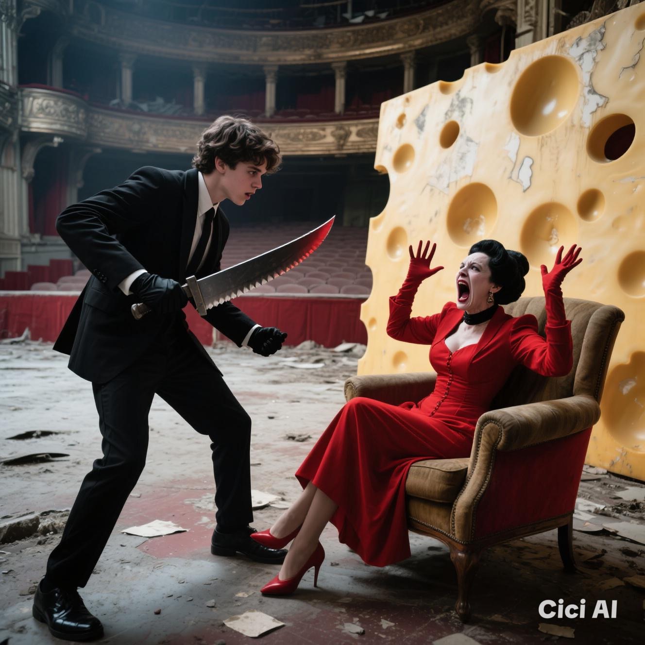 Carlos, humillado, salió del teatro bajo una lluvia torrencial, el hedor de sus pies talla 52 mezclándose con el aroma de la ciudad mojada. En su apartamento, un cuchillo de 50 cm, con hoja dentada como los dientes de un tiburón, brillaba sobre la mesa, junto a un Queso Gruyere hinchado y apestoso, comprado en un mercado clandestino. Los espíritus de la ópera, que lo seguían como sombras, susurraban venganza en su mente, sus rostros de máscara danzando en los espejos. La noche antes del estreno de Rigoletto, Carlos, consumido por la rabia, planeó su revancha. Con guantes negros de cuero que crujían al cerrar los puños, una capa oscura que ocultaba su silueta y el cuchillo envainado, acechó a la Signora Traviata tras su ensayo final. La diva, envuelta en un abrigo de visón, salió del teatro hacia su limusina, pero Carlos, rápido como un espectro, la interceptó en un callejón, cubriendo su boca con un pañuelo empapado en cloroformo. La llevó, inconsciente, al Teatro Antiguo de la Ópera, un edificio condenado a la demolición, cuyas ruinas olían a moho y decadencia.